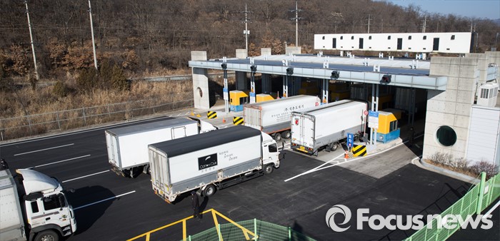 (파주=포커스뉴스) 7일 오후 개성공단 입주기업 차량들이 경기 파주시 남북출입사무소를 통해 입경하고 있다.