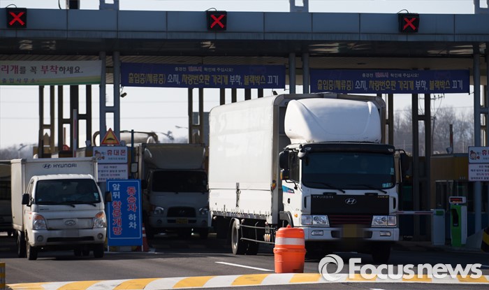 (파주=포커스뉴스) 7일 오후 개성공단 입주기업 차량들이 경기 파주시 남북출입사무소를 통해 입경하고 있다.
