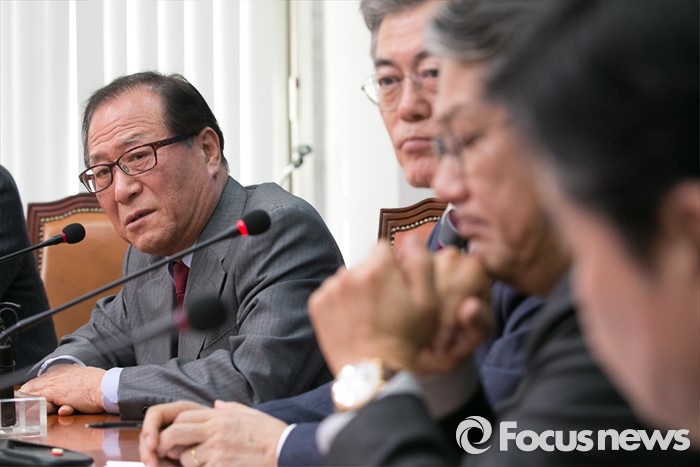 (서울=포커스뉴스) 정세현(왼쪽) 전 통일부 장관이 7일 오후 서울 여의도 국회 더불어민주당 대표실에서 열린 '북한 핵실험 관련 전문가 긴급 좌담회'에 참석해 발언하는 동안, 문재인(오른쪽 세번째) 대표를 비롯한 참석자들이 경청하고 있다.