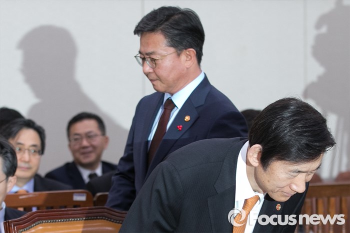 (서울=포커스뉴스) 7일 오후 서울 여의도 국회에서 북한의 수소탄 핵실험 발표 등에 관한 긴급 현안보고를 위해 열린 외교통일위원회 전체회의에 참석한 홍용표(왼쪽) 통일부 장관과 윤병세 외교부 장관이 의원들과 인사한 뒤 자리에 앉고 있다.