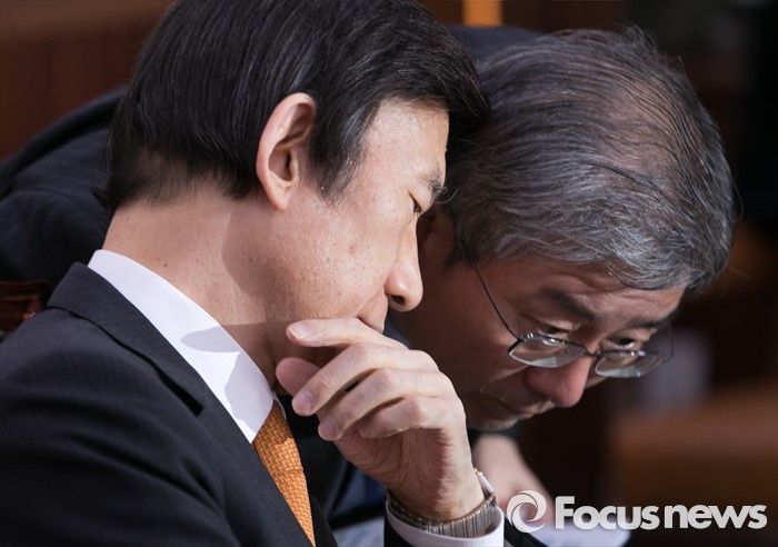 (서울=포커스뉴스) 7일 오후 서울 여의도 국회에서 북한의 수소탄 핵실험 발표 등에 관한 긴급 현안보고를 위해 열린 외교통일위원회 전체회의에 참석한 윤병세(왼쪽) 외교부 장관이 관계자와 대화하고 있다.