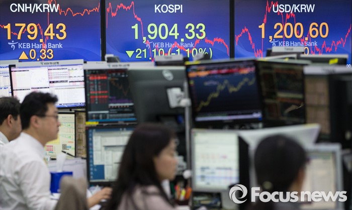 (서울=포커스뉴스) 중국 증시가 7일 또다시 폭락했다. 7일 오후 서울 중구 KEB하나은행 딜링룸에서 직원들이 분주히 움직이고 있는 가운데 코스피지수는 21.10포인트 떨어진 1904.33으로 하락,원 달러 환율은 4개월여만에 1200원을 돌파한 1200.60으로 마감했다.