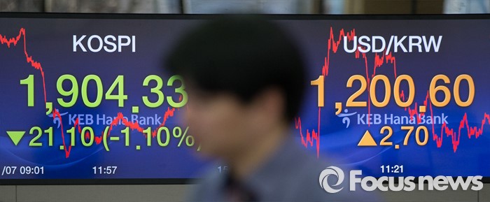 (서울=포커스뉴스) 중국 증시가 7일 또다시 폭락했다. 7일 오후 서울 중구 KEB하나은행 딜링룸에서 직원들이 분주히 움직이고 있는 가운데 코스피지수는 21.10포인트 떨어진 1904.33으로 하락,원 달러 환율은 4개월여만에 1200원을 돌파한 1200.60으로 마감했다.
