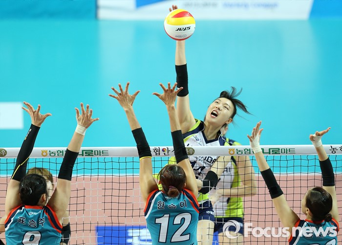 (서울=포커스뉴스) 7일 장충체육관에서 열린 '2015-2016NH농협 V-리그' 여자부 GS칼텍스-현대건설 경기에서 현대건설 양효진이 GS칼텍스 표승주, 한송이, 정지윤의 블로킹 위로 강스파이크를 터뜨리고 있다.