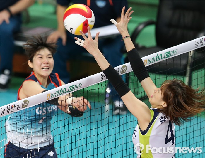 (서울=포커스뉴스) 7일 장충체육관에서 열린 '2015-2016NH농협 V-리그' 여자부 GS칼텍스-현대건설 경기에서 GS칼텍스 이소영이 현대건설 황연주의 블로킹 위로 스파이크를 때리고 있다.