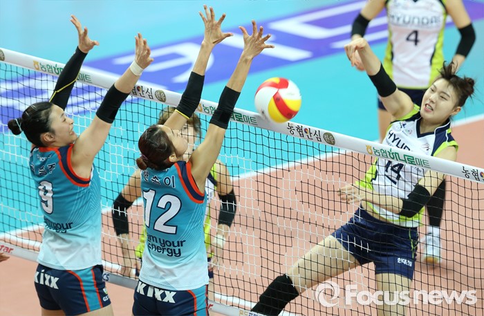 (서울=포커스뉴스) 7일 장충체육관에서 열린 '2015-2016NH농협 V-리그' 여자부 GS칼텍스-현대건설 경기에서 현대건설 양효진이 GS칼텍스 표승주, 한송이의 블로킹을 피해 공격을 하고 있다.
