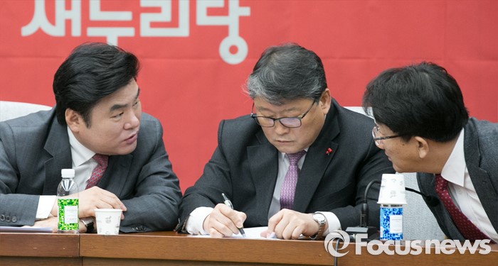 (서울=포커스뉴스) 새누리당 원유철(왼쪽부터) 원내대표와 조원진 원내수석부대표, 권성동 의원이 8일 오전 서울 여의도 국회에서 열린 원내대책회의에 참석해 논의하고 있다.