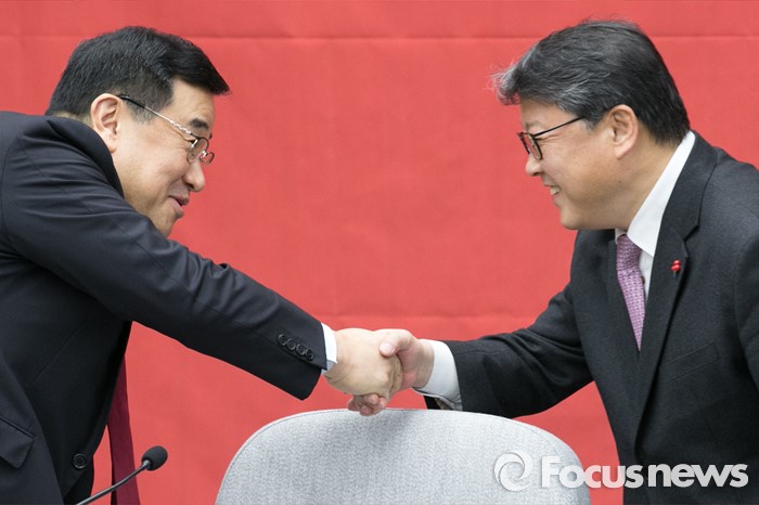 (서울=포커스뉴스) 김정훈(왼쪽) 새누리당 정책위의장과 조원진 원내수석부대표가 8일 오전 서울 여의도 국회에서 열린 원내대책회의에 참석해 악수하고 있다.