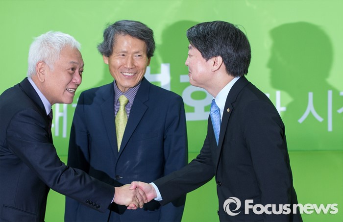 (서울=포커스뉴스) 8일 오전 서울 마포구 안철수 무소속 의원 당사 대회의실에서 열린 창당준비점검회의에 참석한 김한길(왼쪽) 무소속 의원과 안 의원이 악수하고 있다. 가운데는 한상진 공동창당준비위원장과.
