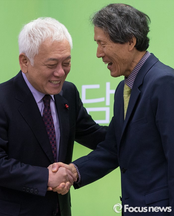 (서울=포커스뉴스) 8일 오전 서울 마포구 안철수 무소속 의원 당사 대회의실에서 열린 창당준비점검회의에 참석한 김한길(왼쪽) 무소속 의원이 한상진 공동창당준비위원장과 악수하고 있다.