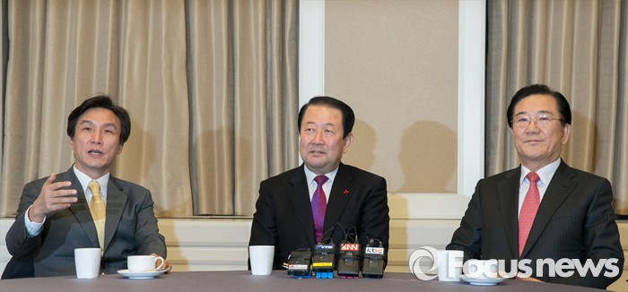 (서울=포커스뉴스) 더불어민주당을 탈당해 신당을 추진 중인 김민석(왼쪽부터) 전 의원, 박주선 의원, 박준영 전 전남지사가 8일 오전 서울 여의도 국회 귀빈식당에서 신당 통합 논의를 위해 만나 취재진에게 설명하고 있다.