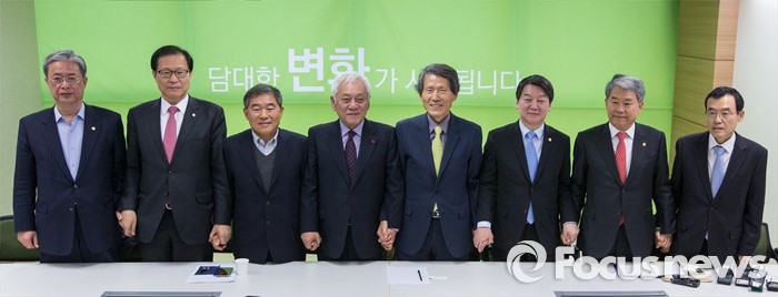 창당준비위원회는 이날 오후 6시 당명을 확정, 발표한다.8일 오전 서울 마포구 안철수 무소속 의원 당사 대회의실에서 열린 창당준비점검회의에서 안 의원이 참석자들과 포즈를 취하고 있다. 왼쪽부터 유성엽 의원, 문병호 의원, 황주홍 의원, 김한길 의원, 한상진 창당준비위원장, 안 의원, 김동철 의원, 임내현 의원. 2016.01.08 양지웅 기자
