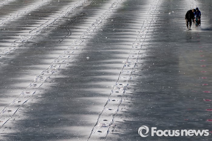 (화천=포커스뉴스) 강원중북부 지역에 한파주의보가 발효된 8일 오전 강원도 화천군 산천어축제 행사장인 화천천 얼음벌판에서 축제 관계자들이 낚시 구멍을 뚫고 있다.
