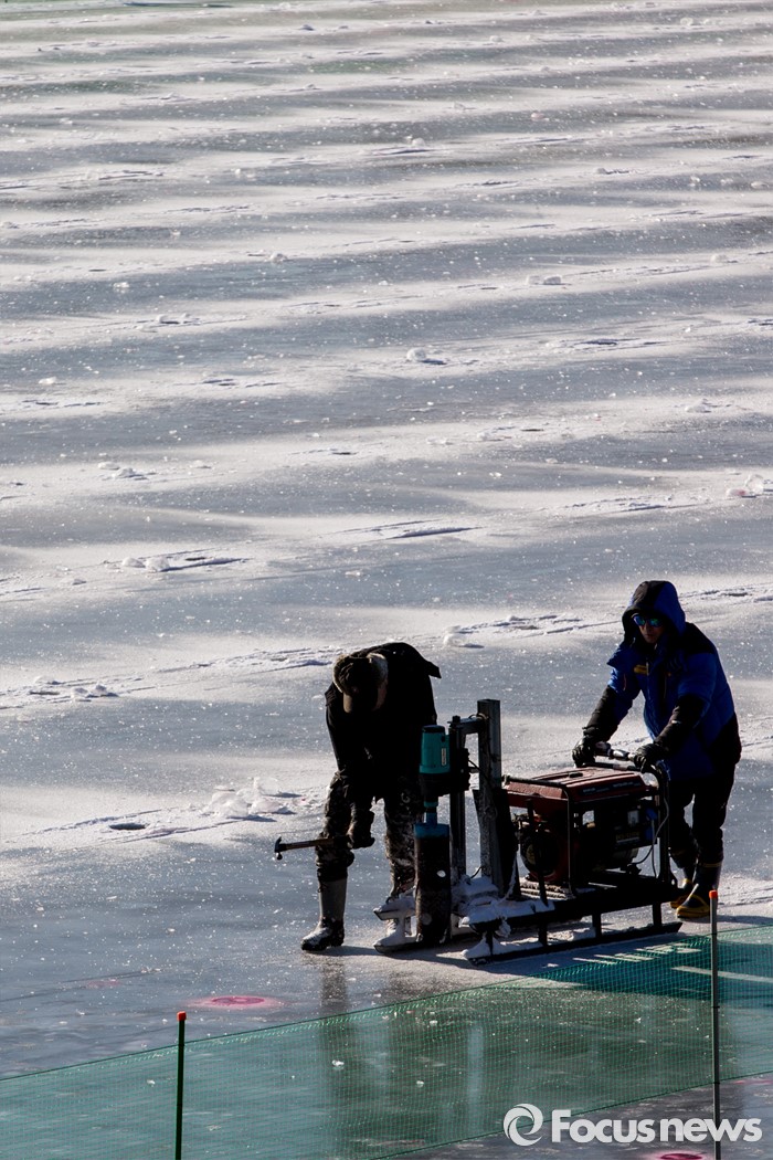 (화천=포커스뉴스) 강원중북부 지역에 한파주의보가 발효된 8일 오전 강원도 화천군 산천어축제 행사장인 화천천 얼음벌판에서 축제 관계자들이 낚시 구멍을 뚫고 있다.