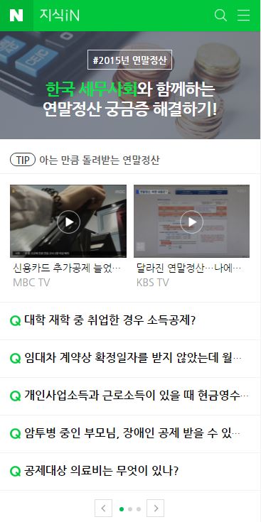 (서울=포커스뉴스) 네이버 지식 공유 플랫폼 '지식iN' 모바일은 연말정산과 관련한 다양한 콘텐츠를 한 데 모아 제공하는 '연말정산 페이지'를 오픈했다고 8일 밝혔다.
