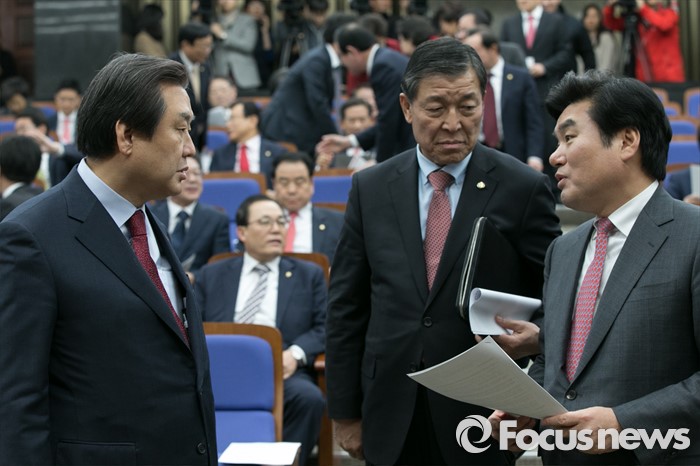 (서울=포커스뉴스) 새누리당 김무성(왼쪽부터) 대표와 원유철 원내대표, 황진하 사무총장이 8일 오후 서울 여의도 국회에서 열린 의원총회에 참석해 논의하고 있다.