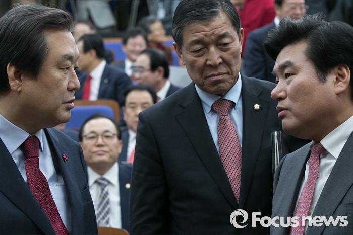 (서울=포커스뉴스) 새누리당 김무성(왼쪽부터) 대표와 원유철 원내대표, 황진하 사무총장이 8일 오후 서울 여의도 국회에서 열린 의원총회에 참석해 논의하고 있다.