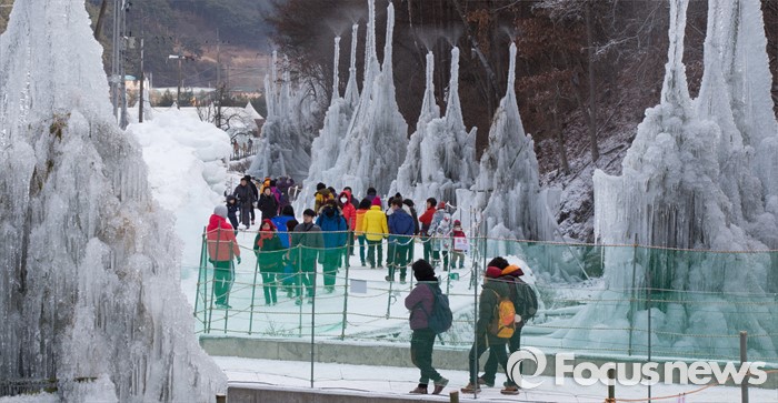 (청양=포커스뉴스) 8일 오전 충남 청양군 정산면 알프스마을에서 열린 칠갑산 얼음분수축제를 방문한 시민들이 분수얼음을 관람하고 있다.