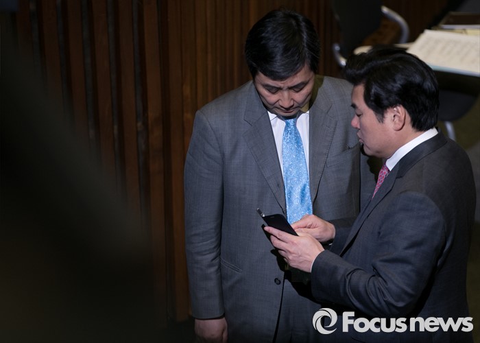 | △ 휴대폰 보며 대화하는 여야 원내대표 |