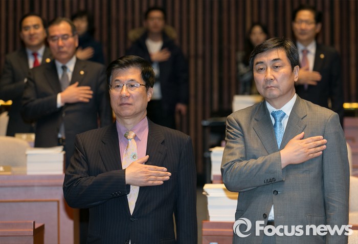 (서울=포커스뉴스) 이종걸 더불어민주당 원내대표와 신경민 정보위원회 야당 간사 등 의원들이 8일 오후 서울 여의도 국회에서 열린 의원총회에 참석해 국기에 대한 경례를 하고 있다.
