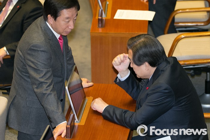 (서울=포커스뉴스) 김무성(오른쪽) 새누리당 대표와 김성태 의원이 8일 오후 서울 여의도 국회 본회의장에서 대화하고 있다.