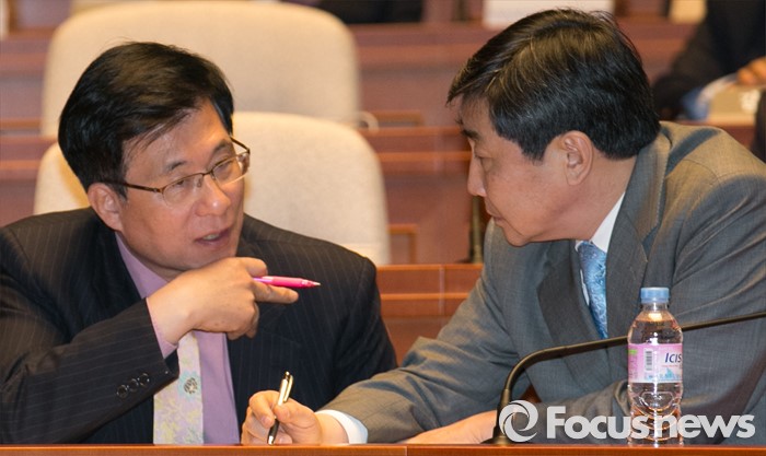 (서울=포커스뉴스) 이종걸(오른쪽) 더불어민주당 원내대표와 신경민 정보위원회 야당 간사가 8일 오후 서울 여의도 국회에서 열린 의원총회에 참석해 대화하고 있다.