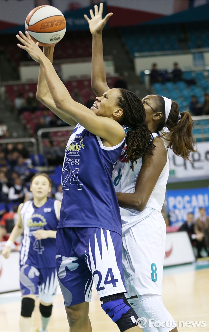(부천=포커스뉴스) 8일 부천체육관에서 열린 2015-2016 여자프로농구 KEB하나은행-신한은행 경기에서 신한은행 모니크 커리가 KEB하나은행 버니스 모스비를 제치고 레이업슛을 시도하고 있다.