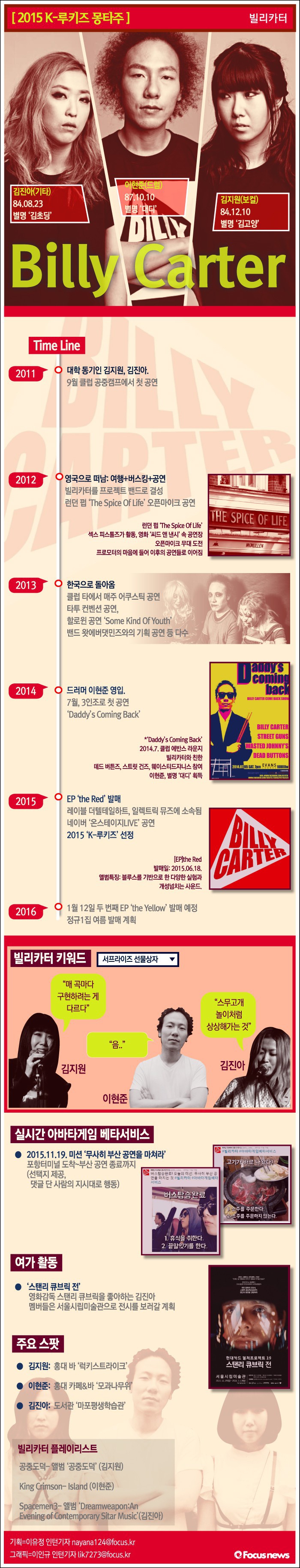 ▶김진아: 이미지는 고정된 것들이 많다. 이미지만 보고 '저 사람은 저럴거야'라는 식. 사람마다 정도의 차이는 있지만 누구나 그렇다. 그런데 그런 이미지도 싫어서 우리는 빌리카터라는 가상의 인물을 만든 거다. 사람들이 마음대로, 자기 좋을 대로 우리를 떠올렸으면 좋겠다. 그냥 '서프라이즈 선물상자' 같은 이미지면 좋지 않을까.(서울=포커스뉴스)오는 1월23일 최고의 루키를 가릴 '2015 K-루키즈 파이널 콘서트’를 앞두고 의욕을 불태우고 있는 기타리스트 김진아, 드러머 이현준, 보컬 김지원으로 구성된 3인조 밴드 빌리카터다. 그래픽=이인규 기자기획=이유정 인턴기자