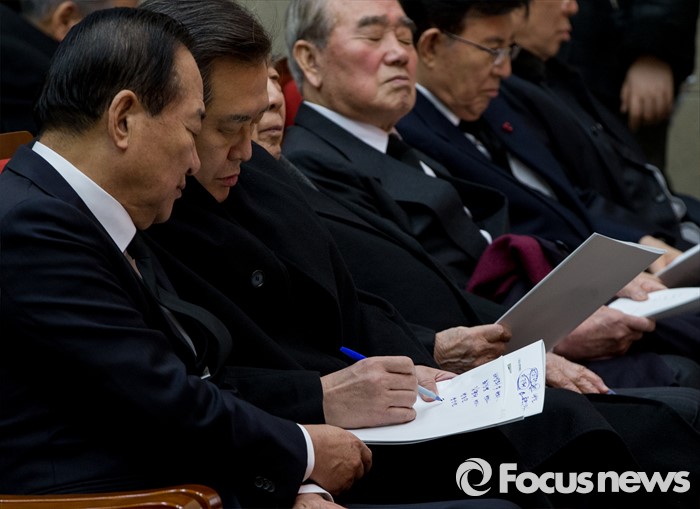 (서울=포커스뉴스) 9일 오후 서울 동작구 국립현충원에서 열린 '김영삼 대통령 추모 부활 성시 기념예배'에 참석한 김무성(왼쪽 두번째) 새누리당 대표와 서청원 최고위원이 필담을 나누고 있다.