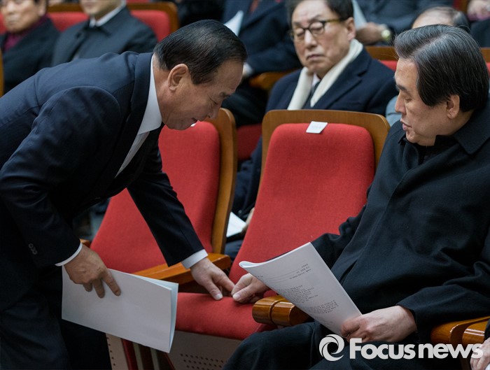 (서울=포커스뉴스) 9일 오후 서울 동작구 국립현충원에서 열린 '김영삼 대통령 추모 부활 성시 기념예배'에 참석한 김무성(오른쪽) 새누리당 대표와 서청원 최고위원이 대화하고 있다.