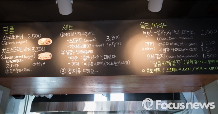 (서울=포커스뉴스)8일 오전 서울 성북구 '영철버거'가게 벽에 붙어 있는 메뉴. 고려대 앞 명물로 꼽히는 '영철버거'가 최근 경영난으로 문을 닫았다가, 고려대를 다녔던 학생들이 영철버거와의 추억을 잊지 못해 십시일반 도와 가게를 옮겨 재오픈 했다.