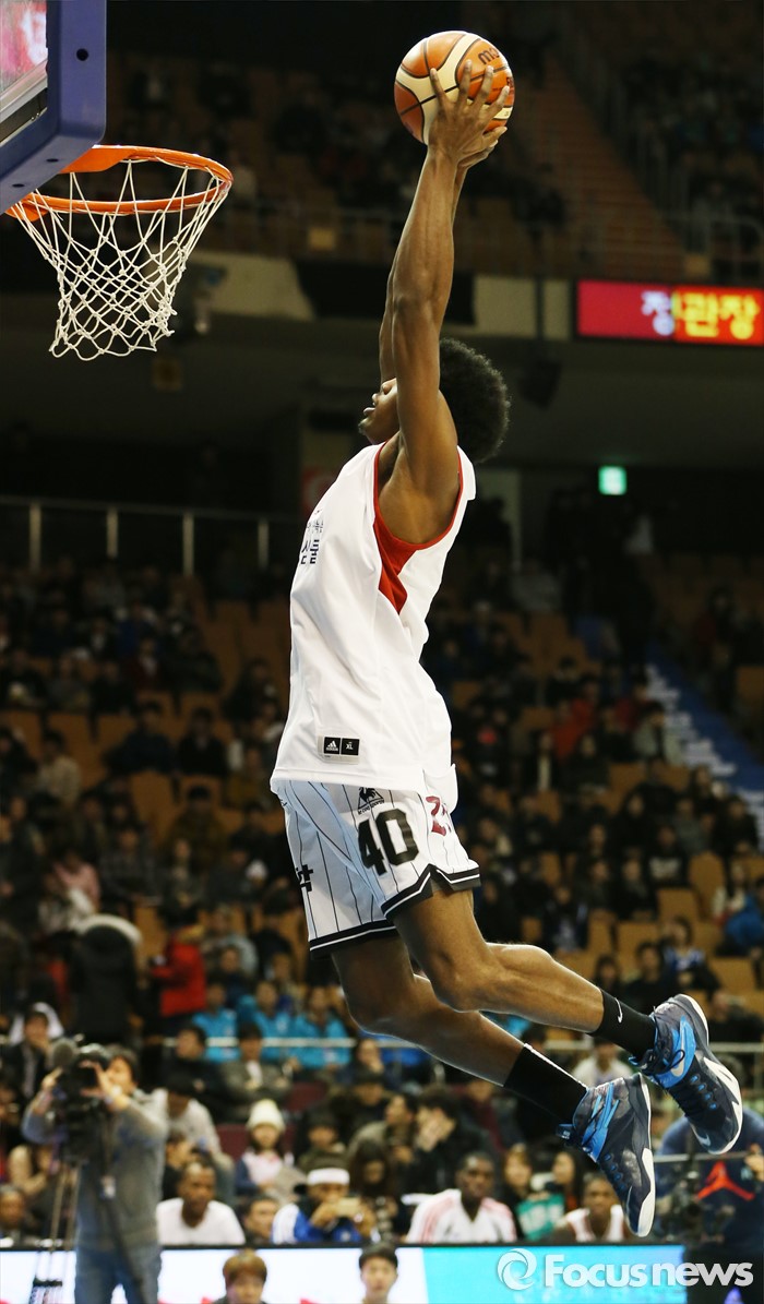 (서울=포커스뉴스) 10일 서울 잠실실내체육관에서 열린 2015-2016 프로농구 올스타전 덩크슛 콘테스트 예선에서 샤크 맥키식이 투핸드 덩크슛을 시도하고 있다.