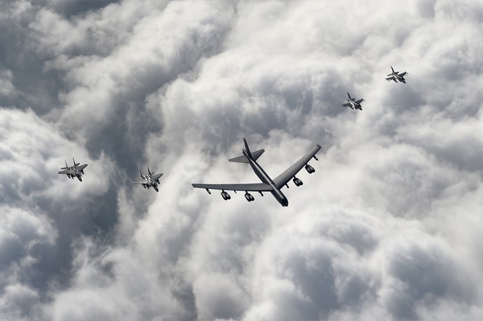 (서울=포커스뉴스) 북한의 수소폭탄 실험 이후 미국의 핵우산 제공 방침에 따라 미 공군의 전략 폭격기가 한반도로 전개한 10일 B-52 폭격기와 우리 공군의 F-15K, 미군 F-16 전투기가 한반도 상공을 날고 있다. <사진제공=공군>