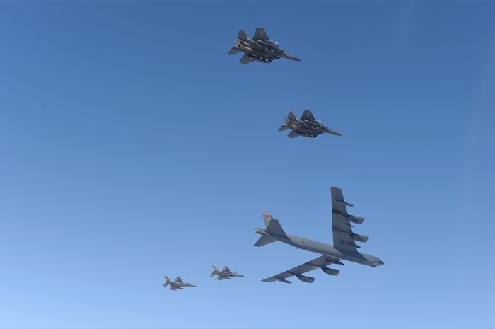 (서울=포커스뉴스) 북한의 수소폭탄 실험 이후 미국의 핵우산 제공 방침에 따라 미 공군의 전략 폭격기가 한반도로 전개한 10일 B-52 폭격기와 우리 공군의 F-15K, 미군 F-16 전투기가 한반도 상공을 날고 있다. <사진제공=공군>