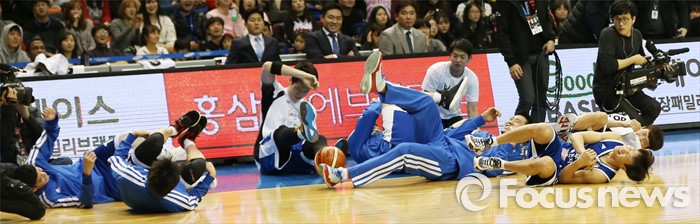(서울=포커스뉴스) 10일 서울 잠실실내체육관에서 열린 2015-2016 프로농구 올스타전 덩크 컨테스트에서 김종규가 굴린 공에 맞은 인간 볼링핀들이 넘어지고 있다.