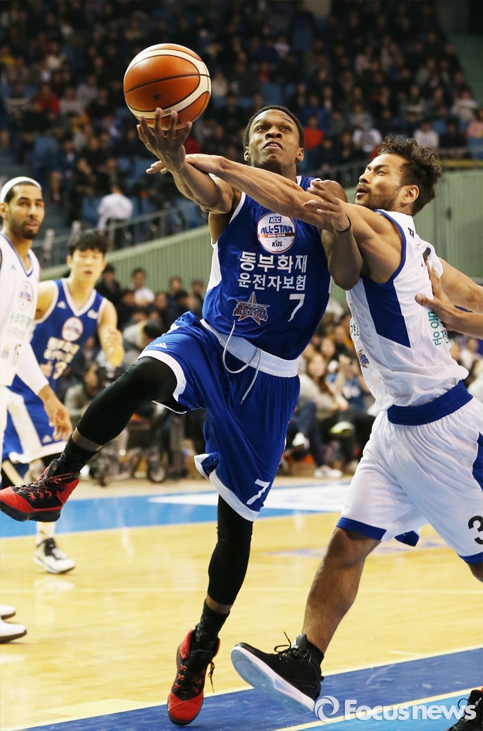 (서울=포커스뉴스) 10일 서울 잠실실내체육관에서 열린 2015-2016 프로농구 올스타전에서 주니어팀 조 잭슨의 레이업슛을 시니어팀 전태풍이 파울로 저지하고 있다.
