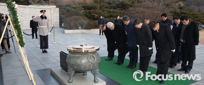(서울=포커스뉴스) '국민의당' 창당을 추진하는 안철수(앞줄 오른쪽 두번째부터) 의원, 한상진 국민의당 공동창당준비위원장, 김한길 의원이 11일 오전 서울 동작구 국립서울현충원을 방문해 참배를 하고 있다.