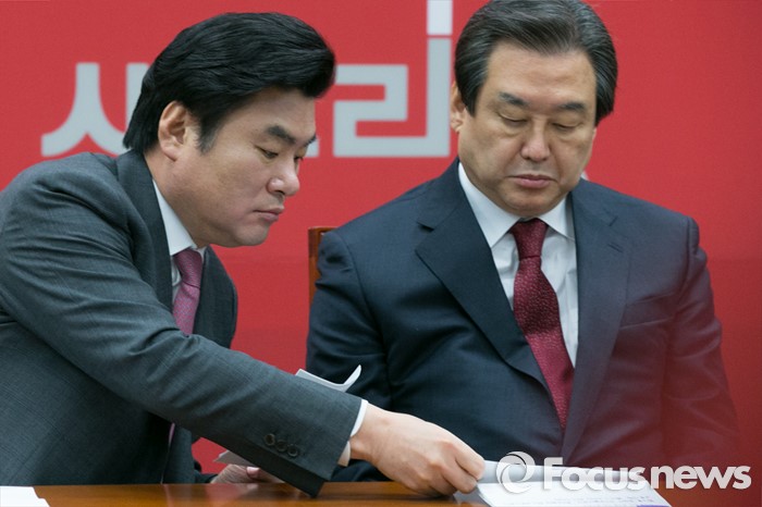 (서울=포커스뉴스) 원유철(왼쪽) 새누리당 원내대표가 11일 오전 서울 여의도 국회에서 열린 최고위원회의에 참석해 김무성 대표에게 문서를 전달하고 있다.