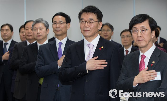 (세종=포커스뉴스) 강호인 국토교통부장관이 11일 오전 세종시 정부세종청사 국토부 대회의실에서 열린 산하단체장 신년인사회에 참석해 국기에 대한 경례를 하고 있다.