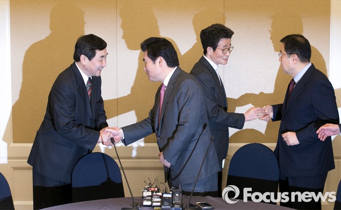 (서울=포커스뉴스) 11일 오전 서울 여의도 국회 귀빈식당에서 20대 총선 선거구 획정 기준 및 쟁점 법안 논의를 위해 진행된 여야 원내지도부 회동에 참석한 의원들이 인사하고 있다. 왼쪽부터 이종걸 더불어민주당 원내대표, 원유철 새누리당 원내대표, 이목희 더불어민주당 정책위의장, 김정훈 새누리당 정책위의장.