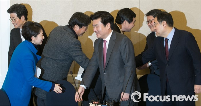 (서울=포커스뉴스) 11일 오전 서울 여의도 국회 귀빈식당에서 20대 총선 선거구 획정 기준 및 쟁점 법안 논의를 위해 진행된 여야 원내지도부 회동에 참석한 의원들이 인사하고 있다. 왼쪽부터 이목희 더불어민주당 정책위의장, 이언주 원내대변인, 이춘석 원내수석부대표, 원유철 새누리당 원내대표, 이종걸 더불어민주당 원내대표, 조원진 새누리당 원내수석부대표, 김정훈 정책위의장.