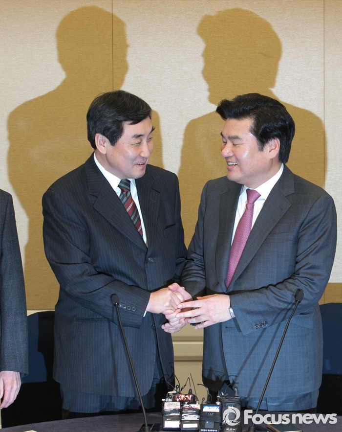(서울=포커스뉴스) 11일 오전 서울 여의도 국회 귀빈식당에서 20대 총선 선거구 획정 기준 및 쟁점 법안 논의를 위해 진행된 여야 원내지도부 회동에 참석한 원유철(오른쪽) 새누리당 원내대표와 이종걸 더불어민주당 원내대표가 인사하고 있다.