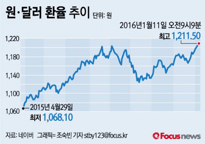 이날 서울 외환시장에서 원·달러 환율은 전 거래일보다 8.0원 오른(원화 가치 하락) 1206.1원으로 개장한 뒤, 1211.5원까지 무서운 속도로 원화 가치가 폭락했다. 원·달러 환율이 1210원을 넘어선 것은 2010년 7월 22일(1210.0원)이후 5년 6개월 만이다.