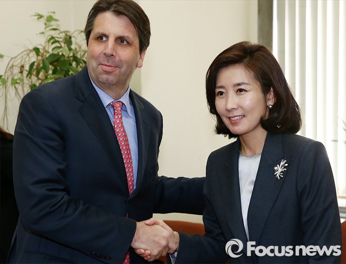 (서울=포커스뉴스) 11일 오후 서울 여의도 국회 외교통일위원회에서 열린 북한 핵실험 관련 간담회에 참석한 나경원(오른쪽) 위원장과 마크 리퍼트 주한미국대사가 인사하고 있다.