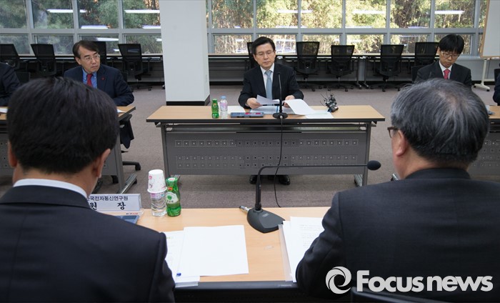 (대전=포커스뉴스) 황교안 국무총리가 11일 대전 유성구 융합기술연구생산센터를 방문, 출연연-중소·중견기업과 간담회를 갖고 있다.