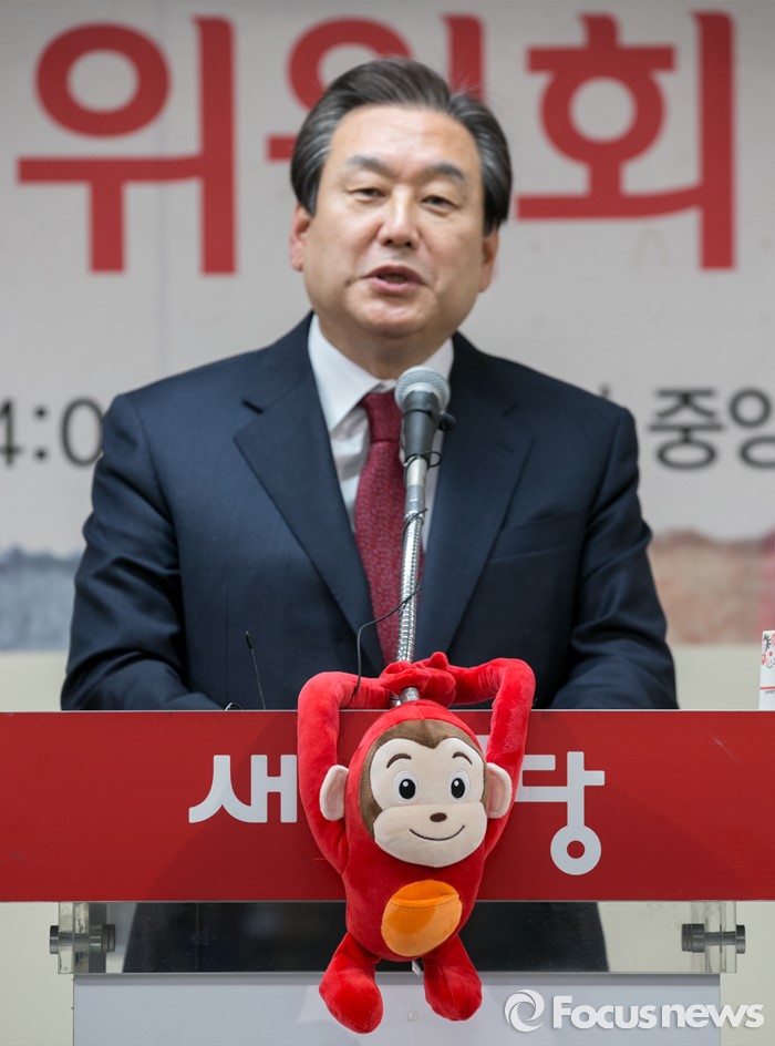 (서울=포커스뉴스) 김무성 새누리당 대표가 11일 오후 서울 여의도 당사에서 열린 2016 중앙여성위원회 신년인사회에 참석해 붉은 원숭이 인형을 단상에 걸고 축사를 하고 있다.