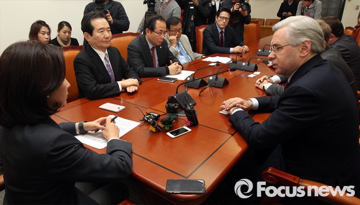 (서울=포커스뉴스) 11일 오후 서울 여의도 국회 외교통일위원회에서 나경원 위원장과 여야 의원, 알렉산드르 안드레예비치 티모닌 주한러시아대사가 북한 핵실험 관련 간담회를 하고 있다.