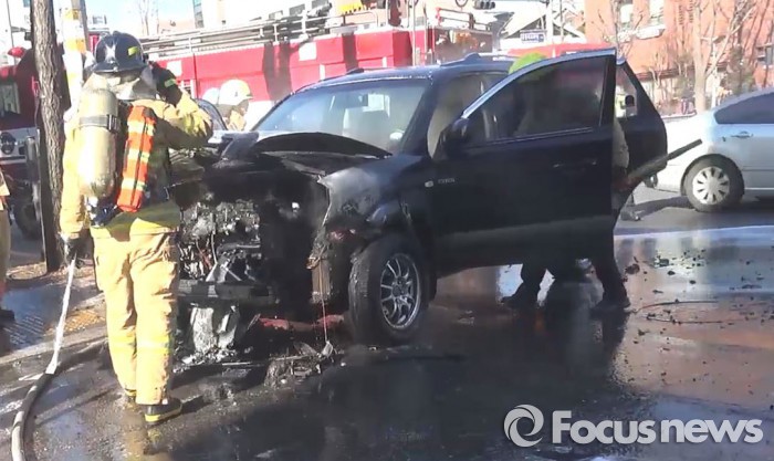 (서울=포커스뉴스) 11일 오후 1시 31분쯤 서울 양천구 목동 양동중학교 인근 목동중앙북로를 운행 중이던 현대자동차 투싼 차량 엔진룸에서 화재가 발생해 5분여만에 완전히 꺼졌다.