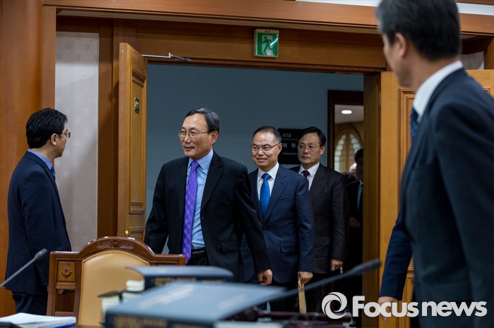 (과천=포커스뉴스) 이인복 중앙선거관리위원회 위원장을 비롯한 위원들이 11일 오후 경기도 과천시 중앙선거관리위원회에서 열린 전체회의에 참석하기 위해 회의실로 들어서고 있다. 이날 이 위원장은 오는 4월 13일 총선 '선거구 실종' 장기화 사태에 따른 대책을 모색할 예정이다.