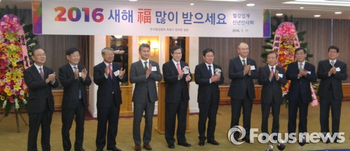 이번 신년인사회에는 윤상직 장관과 권오준 회장 외에도 우유철 현대제철 부회장, 장세욱 동국제강 부회장, 김창수 동부제철 사장, 이순형 세아제강 회장, 송재빈 철강협회 상근 부회장, 손봉락 TCC동양 회장, 홍영철 고려제강 회장, 이승휘 세아베스틸 부회장 등 철강업계 관계자 250여명이 참석했다.11일 오후 서울 대치동 포스코센터에서 윤상직 산업통상자원부 장관, 권오준 회장 철강관련 인사 250여명이 참석한 가운데 2016년 철강업계 신년인사회가 열렸다. 2016.01.11 송상현 기자